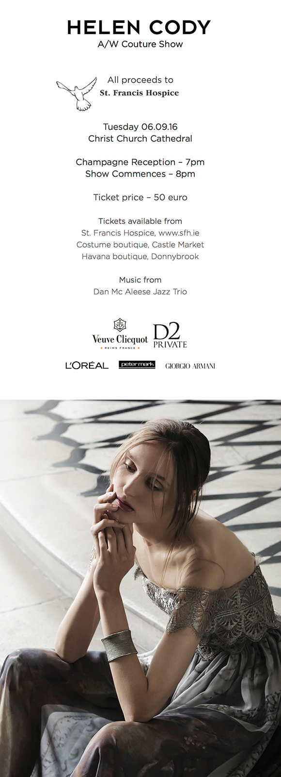 We are delighted to announce our A/W Couture Show, which will take place on Tuesday the 6th of September, in Christ Church Cathedral in aid of St. Francis Hospice.